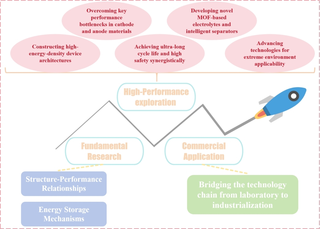文章指出,尽管MOFs在提升电极比容量、改善离子传输动力学、抑制枝晶生长以及增强界面稳定性等方面具有显著优势,但其产业化仍面临来自材料本征特性和器件工程的多重挑战。需要特别强调的是,要实现高性能MOFs基电池,必须实现各组件之间的协同优化,而非仅仅提升单一材料的性能。并指出关键研究方向亟需深入探索的领域。