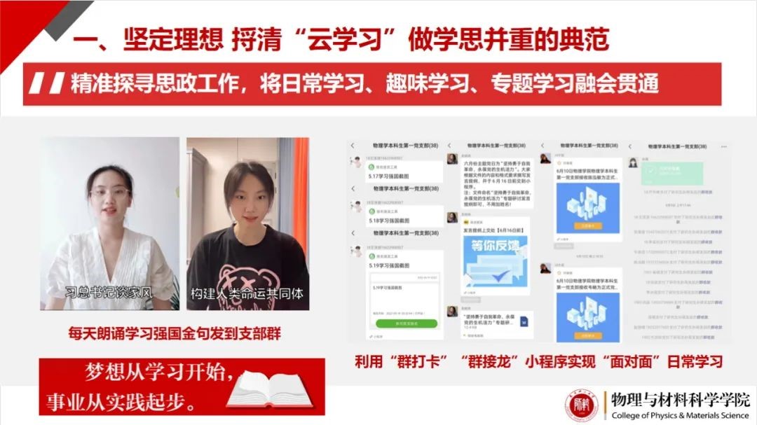 党支部精准探寻青年学生思政工作,将日常学习、趣味学习、专题学习以更加现代化的形式融入网络,融会贯通。没有线下学习机会,党支部党员就在线上利用“群打卡”“群接龙”小程序,轮流朗诵强国金句,完成学习强国积分接龙,实现“面对面”日常学习;没有现场活跃的气氛,支部就组织学习强国双人对抗循环赛,分享人民日报、抖音、快手平台上喜闻乐见的内容实现趣味学习;没有现场的语言共鸣,支部就召开“网络研讨班”,以专题党课形式与天津大学、北京师范大学以及学院教授们深入交流,让思政教育与物理知识同频共振实现专题学习。线下有什么,党支部云学习就有什么。