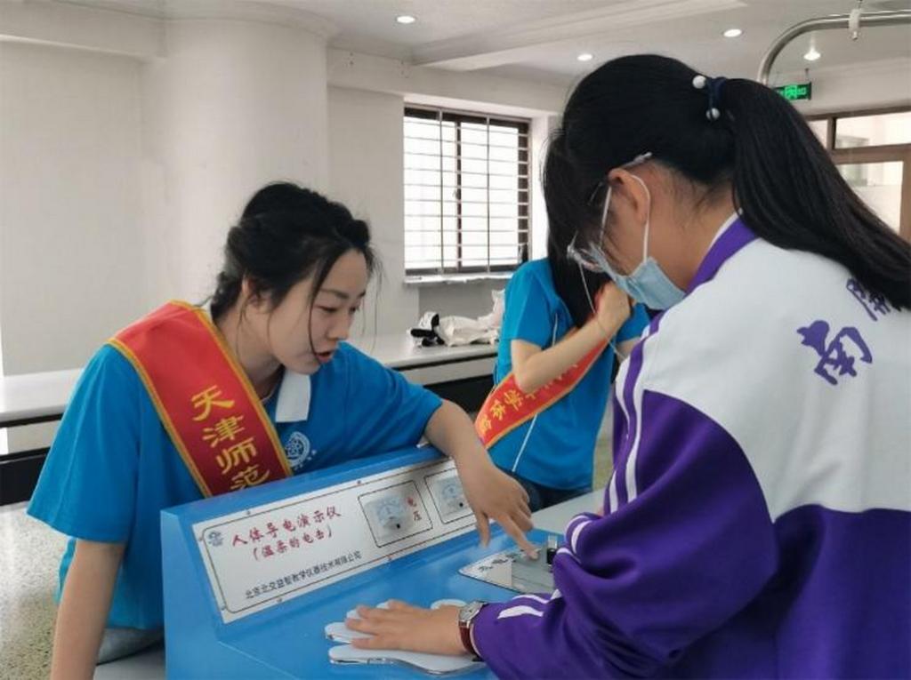 党员们走进南开中学,通过茹可夫斯基凳、角动量守恒转台等先进的实验教学仪器为高一高二年级学生带来了一场热烈的头脑风暴,使中学生感受身边科学之美。