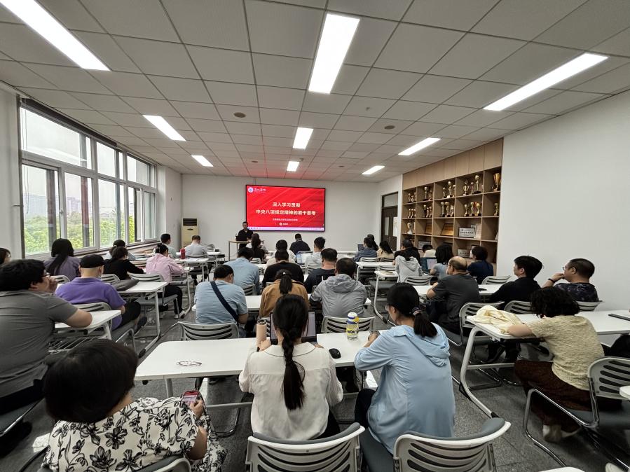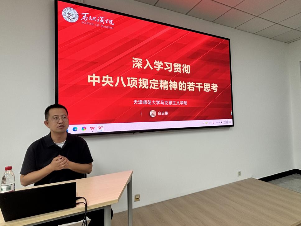 白启鹏教授从近期中共中央、国务院印发了修订后的《党政机关厉行节约反对浪费条例》和学习《习近平关于加强党的作风建设论述摘编》体悟引入,介绍了开展深入贯彻中央八项规定精神学习教育的重要意义。之后,他详细介绍了中央八项规定的出台、中央八项规定的主要内容,并结合典型案例,深入剖析了违反中央八项规定精神的具体表现。最后,他从构建常态长效的贯彻中央八项规定及其实施细则精神的落实机制进行了阐释解读,围绕日常教育制度化、警示教育场景化、文化浸润立体化等方面进行介绍,号召广大干部教师在学习教育中要做到深学细悟、严查细照、实改真促,真正将学习教育成效体现在推动学院事业高质量发展的实际行动中。